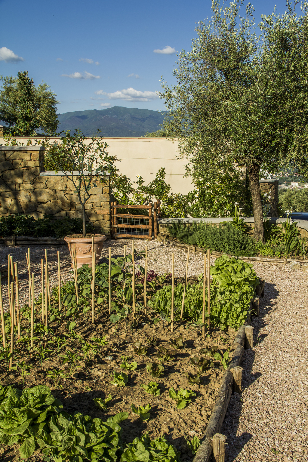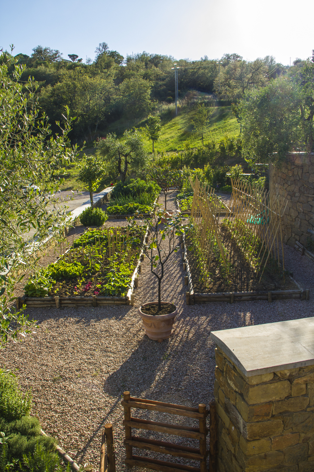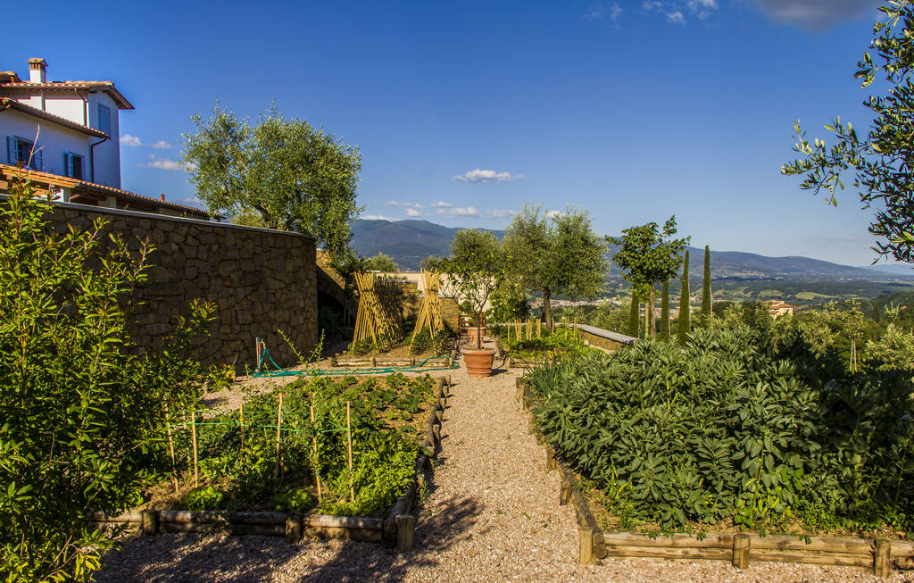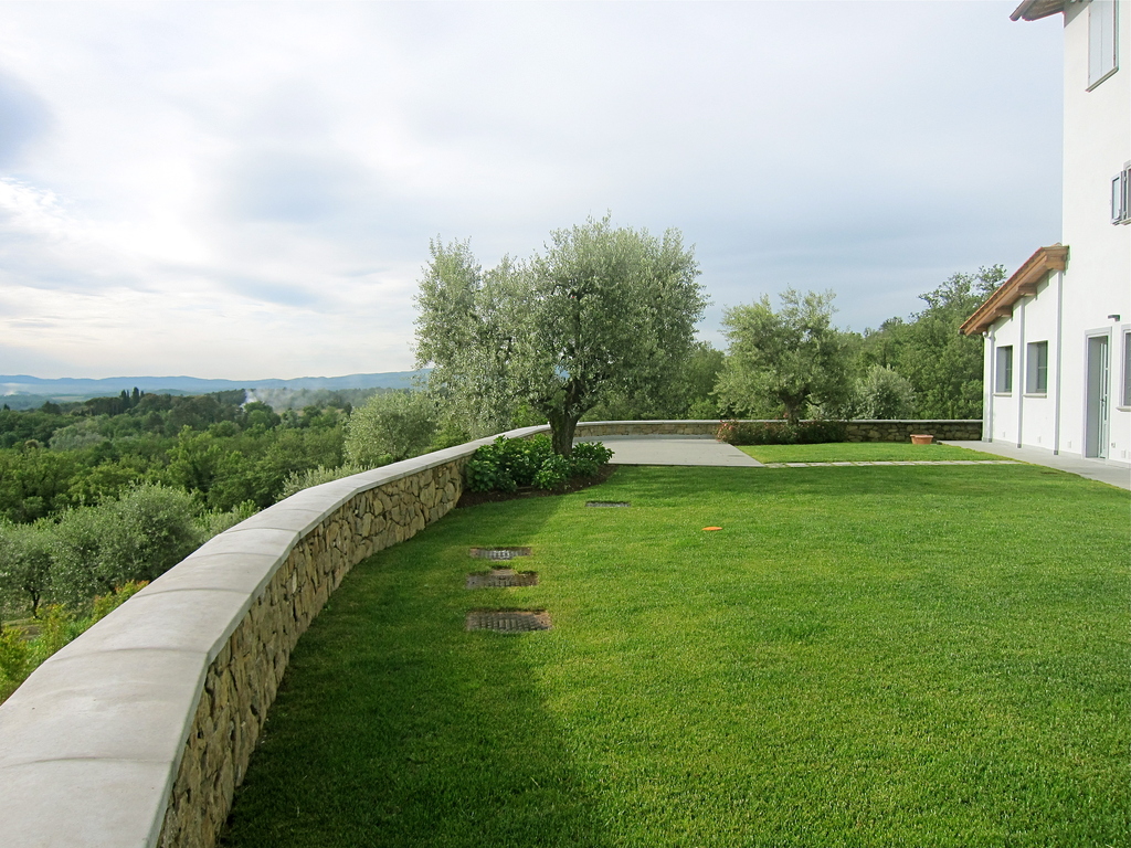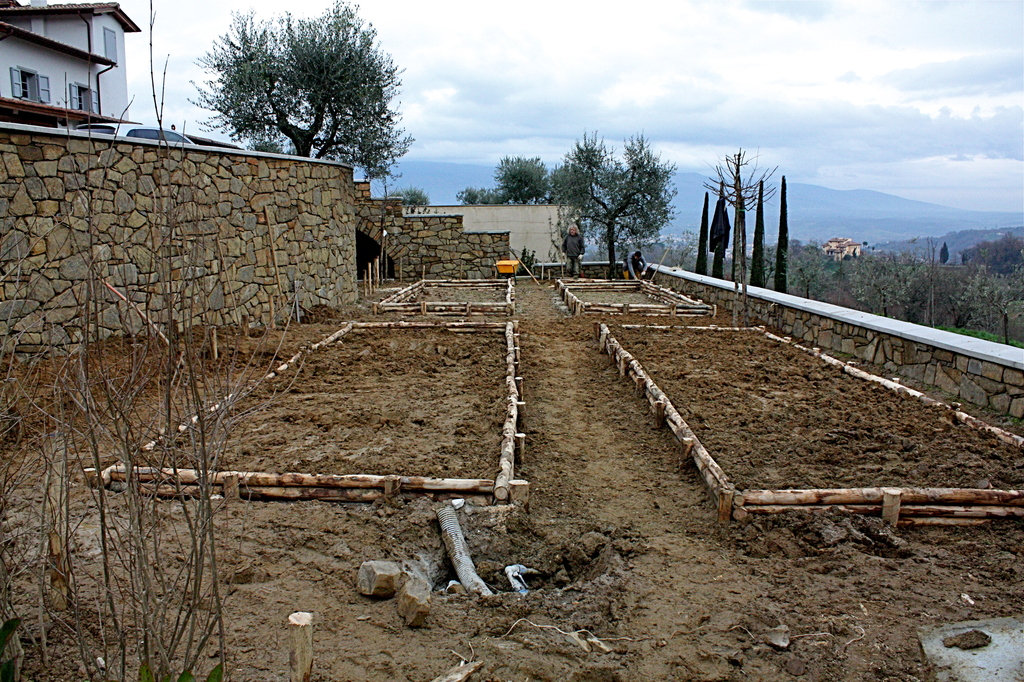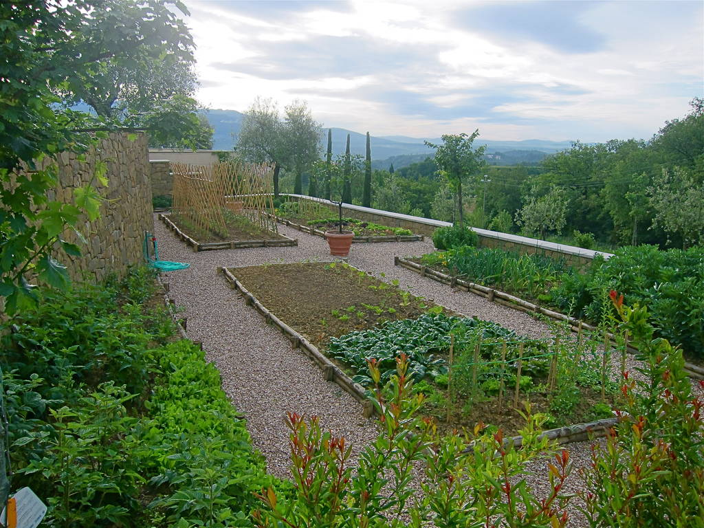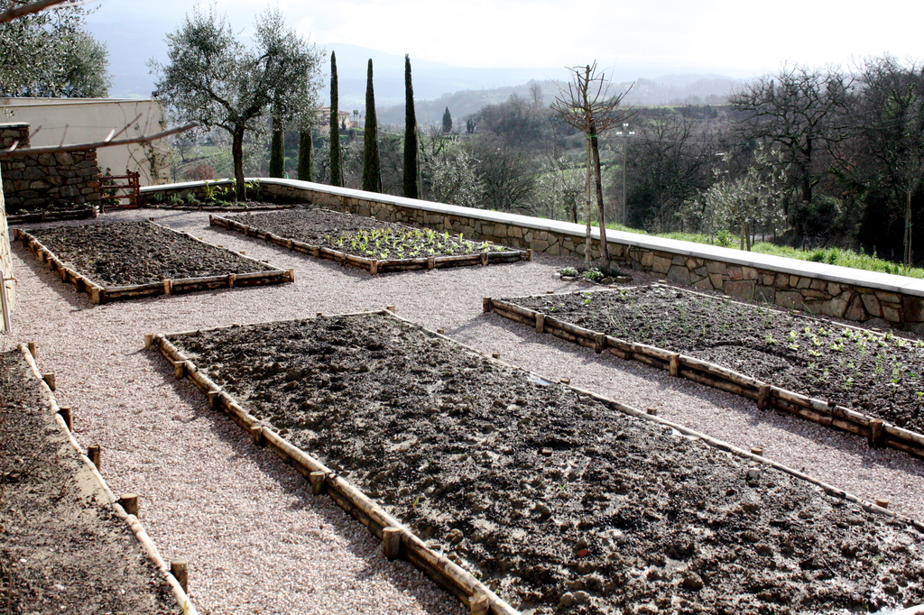 La posizione degli orti, dell'aia, del frutteto è quella ritrovata nei catasti antichi e precisamente nel catasto leopoldino ( fonte inesauribile di storia del paesaggio toscano). Abbiamo così provveduto a spostare la strada di accesso all'abitazione per riposizionare l'aia nella posizione ottocentesca, luogo che era il fulcro della vita contadina, al riparo dai venti e che torna ad essere considerato oggi il centro della vita abitativa.