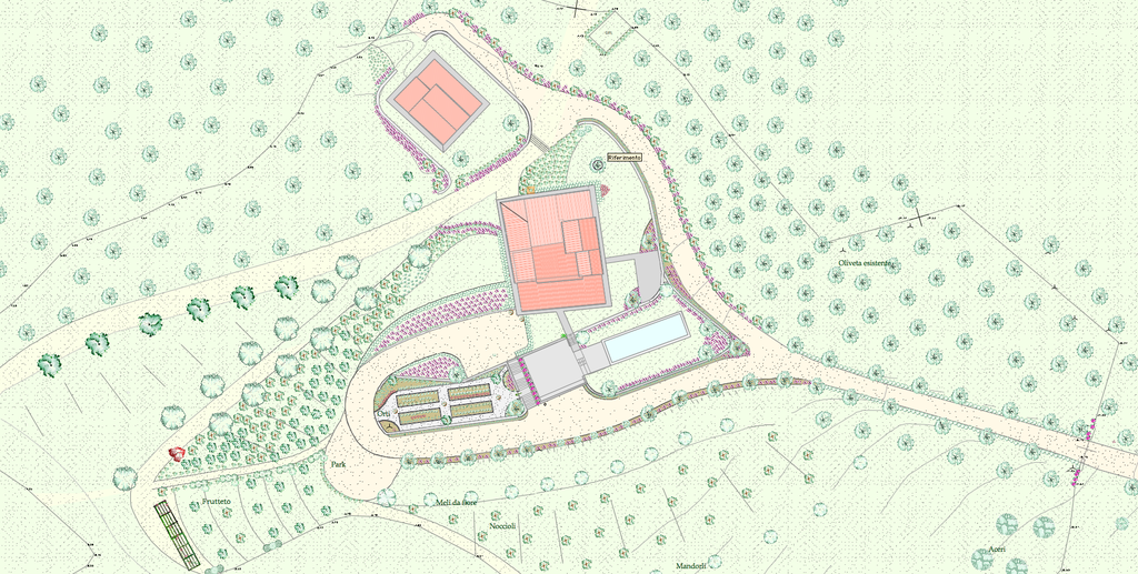 Lo studio dei segni del passato, attraverso la cartografia antica ha guidato il progetto, un progetto pensato, disegnato e poi costruito. Sono state previste trasformazioni e sistemazioni importanti del terreno, con terrazzamenti e muri a secco, al fine di ricreare un ambiente piacevole alla vita degli ospiti e favorevole aale coltivazioni, alle sistemazioni idriche e alla manutenzione dei terreni.