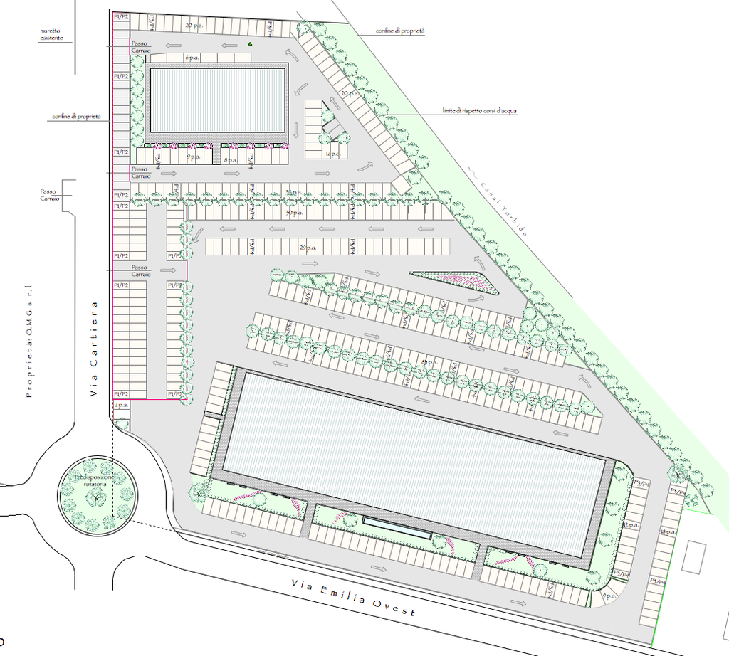 Il progetto prevede la realizzazione di due edifici: uno ad uso commerciale , servizi e direzionale (edificio A) ed uno ad uso artigianale/industriale (edificio B). L'edificio A viene disposto su due piani fuori terra con dimensioni di mt. 110 di lunghezza e 35 mt. di larghezza. Il piano terra avrà un'altezza di mt. 3,00 circa; nell'edificio sono previsti mq. 2500 lordi di attività commerciali suddivise in varie unità immobiliari; la restante superficie disposta al piano primo, sarà suddivisa in attività di servizio e direzionale.